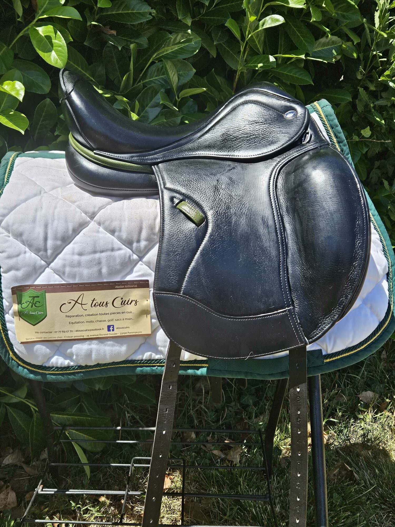 A louer : selle 15 pouces, mixte, noire, forestier, arcade moyenne, double quartier